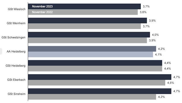 Im November sind 134 Menschen in Heidelberg und dem Rhein-Neckar-Kreis weniger arbeitslos als im Oktober. Damit sinkt der Bestand auf 16.186 Menschen und die Arbeitslosenquote bleibt bei 4,2 Prozent. Der Vergleich zum Vorjahr zeigt, dass die Arbeitslosenquote in diesem Jahr um 0,1 Prozent höher liegt und der Bestand an Arbeitslosen um 3,8 Prozent größer ist. Damit steht der Arbeitsmarkt der Region vergleichsweise gut da. Die Arbeitslosenquote in Baden-Württemberg stieg im Vergleich zum Vorjahr um 0,3 Prozent und der Bestand an Arbeitslosen sogar um neun Prozent.