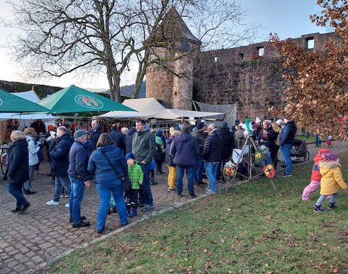 Besucher aus nah und fern genossen die besondere Atmosphäre der mittelalterlichen Befestigungsanlage, lichttechnisch speziell betont. Es herrschte an beiden Tagen eine freudige Stimmung. Unter beiden Toreingängen lud ein Mistelstrauß zum Küssen ein. Die Gelegenheit wurde gerne genutzt, und es waberten Gerüche von Süßem und Deftigem durch den Burghof. Das Programm lud zum Verweilen ein.