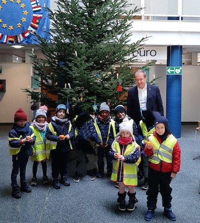 Ein weihnachtlicher Einsatz  (Foto: Stadtverwaltung)(bro) (stve) Rechtzeitig zur Adventszeit bekam Bürgermeister Peter Reichert im Eberbacher Rathaus Besuch von Kindern und Betreuerinnen des katholischen Kindergarten St. Elisabeth.