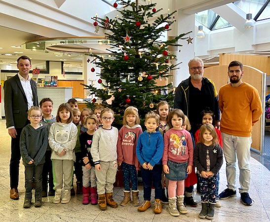 Regenbogen-Kinder dekorierten mit großer Begeisterung (Foto: Sparkasse Neckartal-Odenwald)(bro) (stb) In der Vorweihnachtszeit haben die Kindergartenkinder aus dem Kindergarten Regenbogen gemeinsam mit ihrem Erzieher den Weihnachtsbaum in der Hauptstelle Eberbach geschmückt. Dass die Weihnachtsbäume in den Haupt- und Geschäftsstellen von Kindern geschmückt werden, ist bei der Sparkasse Neckartal-Odenwald bereits eine langjährige Tradition.