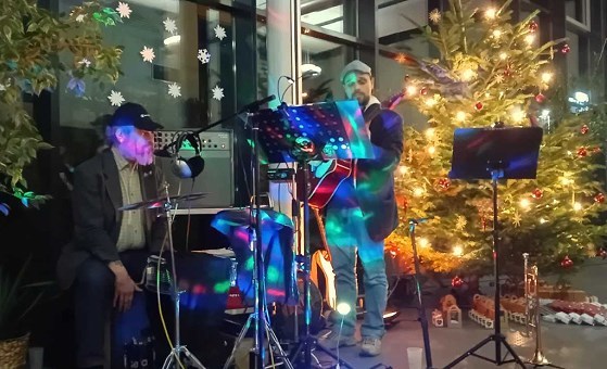 Nach dem Essen gab es ein kleines Programm, das eine kurze Andacht über die Tradition des Honigkuchens beinhaltete, genauso wie die Lesung der Weihnachtsgeschichte aus dem Lukas-Evangelium. Zwischendurch wurde immer wieder zusammen gesungen. Traditionelle Weihnachtslieder, die überall bekannt sind, wurden von Günther Schork und Jens Rast musikalisch begleitet.