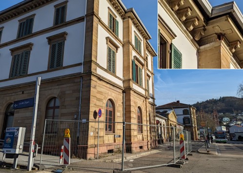 Am Donnerstagnachmittag, 25. Januar, waren Steinteile aus dem Dachvorsprung des Bahnhofs auf den Platz gefallen und hatten glücklicherweise niemanden verletzt. Die Polizei sperrte als Sofortmaßnahme den Gefahrenbereich ab, und der städtische Bauhof stellte anschließend die Sperrgitter auf.