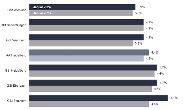 Saisonaler Anstieg der Arbeitslosigkeit  Die Arbeitslosigkeit im Januar nach Geschäftsstellen. (Quelle: Agentur für Arbeit)(bro) (aa) Die Arbeitslosigkeit im Bezirk Eberbach ist von Dezember auf Januar um zehn auf 448 Personen gestiegen. Die Arbeitslosenquote betrug im Januar 4,7 Prozent, vor einem Jahr belief sie sich auf 4,5 Prozent.
