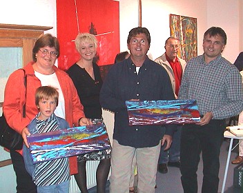 Rainer Schillings stellt aus - Bild an Gewinnerin übergeben V.l. Gewinnerin Elvira Müller mit Tochter, Petra Ostermaier von Mona Leasing, Rainer Schillings und Hubert Richter vom EBERBACH-CHANNEL bei der Gewinn-Überreichung. (Foto:C.Richter)(hr) Bilder von Rainer Schillings gibt es seit gestern abend bei Mona Leasing in der Hauptstraße 19 in Eberbach zu sehen. Der Hamburger Journalist, der seine Schulzeit in Eberbach verbrachte, malt farbenfrohe Acrylbilder, mit denen er seiner Lebensfreude Ausdruck verleihen will. Seine Hauptmotive entstammen der maritimen Welt. Die Ausstellung ist bis 30.September montags bis freitags von 14 bis 18 Uhr und samstags von 10 bis 14 Uhr geöffnet. Petra Ostermaier von Mona Leasing bietet die Bilder nicht nur zum Verkauf, sondern auch zum Leasing an. Weitere Infos git es unter Tel. (06271) 71976 oder per E-Mail (s.u.).