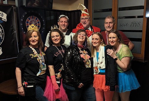 Unser Bild zeigt die Rednerinnen und Redner der “Tour de Bütt” 2024 mit Tourchef Bernhard Walter beim Auftakt im Treffpunkt-Lokal “Querbeet” in der BahnhofstraĂźe.