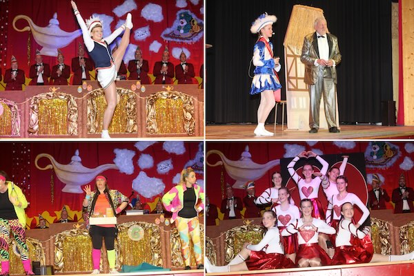 Nach den zweimal elf Minuten Verschnaufpause starteten die Narren gleich im ersten Programmpunkt wieder voll durch. Die Gammelsbacher Philharmoniker in Gestalt von Michael Gruber, Max Schultz, Justin Ruf, Ralf „Johnny“ Johann, Nina Ruf und Frontmann Andreas Weinmann spielten jede Menge Klassiker der „Neuen Deutschen Welle“ auf rockige Art und Weise nach und brachten den Saal sofort wieder in Wallung. Ins Büro der Schreinerei „Fracht und Preidel“ entführte das kongeniale Duo Dennis Hemberger und Felix Sasse die Närrinnen und Narrhallesen anschlieĂźend. Bei ihrer Ăśbung für eine Weinprobe im Rathaus hatte insbesondere der Schreinermeister am Ende latente Koordinationsschwierigkeiten, kam aber trotz diverser Stürze glimpflich davon. Die Lachsalven des Publikums entlohnten ihn aber sicherlich für seine blauen Flecken. Auf den Schultern eines Kamels riet im Anschluss daran Aladin beim Auftritt der Wild Angels durch die Narrhalla. Die von Charlotte Röglin betreuten Mädels lieferten einen Showtanz der Extraklasse und kamen auch nicht um die obligatorische Auszugsmarschzugabe herum. Eine absolute Bühnenlegende gestaltete den darauf folgenden Programmpunkt. Die unvergleichliche Heike Johe schritt durch den Saal, plauschte zunächst eine Weile angeregt mit dem Bürgermeister, ehe sie die Bühne enterte und dort viele weitere Bonmots zum Besten gab. Die beiden finalen Programmpunkte vor dem Abschluss mit den Galgenvögeln wurden dann tänzerisch gestaltet. Zunächst traten die von Katharina Hofmann trainierten Blutdruckmesser auf den Plan. Sie interpretierten die Flintstones, flankiert von diversen Steinzeit-Frauen und -Männern. Anmut und Eleganz sehen sicherlich anders aus, aber dennoch gelang es auch, mit diesem Tanz den Saal zu fesseln und zu stehenden Ovationen hinzureiĂźen. Das tänzerische Sahnehäubchen platzierten schlieĂźlich die von Ina Bottelberger und Michèle Sasse instruierten Dream Girls. Einige der größten weiblichen Musik-Ikonen (Nena, Cher, Whitney Houston, Madonna, Tina Turner) fanden den Weg nach Beerfelden und tanzten zu ihren größten Erfolgen der Vergangenheit. Mitsing-Garantie bei den Zuschauern war hier naturgemäß klar, und auch diese Gruppe durfte die Bühne nicht ohne ihre kleine Zugabe verlassen. Mit Sombreros und Ponchos bekleidet waren es traditionell die Galgenvögel, die mit ihrem Medley zum Thema Mexiko noch mal Stimmung in den Saal brachten und abschlieĂźend ihren Evergreen „Das war die Beerfelder Fassenacht …“ intonierten.