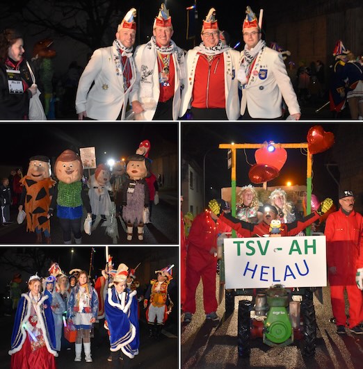 Fantasievolle Wagen und FuĂgruppen zogen bei der Dunkelheit durch den Ort. Insgesamt waren 31 Zugnummern unterwegs. Erwachsene und Kinder feierten an der Strecke, die meisten waren verkleidet. Unter den Besuchern war auch Bürgermeister Christian Kehrer. Stark vertreten waren wie in den Jahren davor Gruppen aus dem Tal der Liebe. Neben dem Komiteewagen vom TSV und MGV, der in diesem Jahr zum Gutzel-Express unbenannt worden ist, waren die Tanzgarden des TSV mit beiden Funkenmariechen Miley Sue Daub und Anna SchĂ€fer, das Tanzpaar (Dalma und Lilla Trakperger) sowie die Showtanzgruppen des TSV am Start.