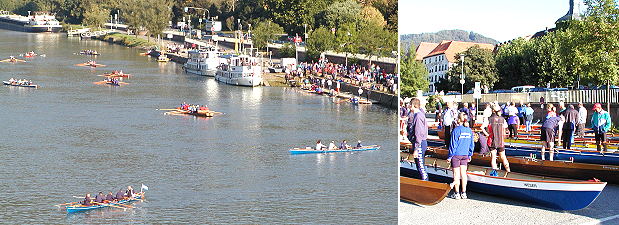 Video ansehen(jc) Großer Andrang herrschte heute am Neckarlauer bereits zu früher Stunde. Rund 650 Ruderer aus ganz Deutschland wasserten ab 8 Uhr ihre insgesamt etwa 130 Boote, um sich auf ihre Wanderrudertour nach Heidelberg zu begeben. Mehrere Verpflegungsstationen konnten entlang der rund 30 km langen Strecke in Anspruch genommen werden. Zahlreiche Zuseher beobachteten das Treiben unter anderem von der Neckarbrücke. Die Rudergesellschaft Eberbach hatte zusammen mit dem Heidelberger Ruderclub mit dem 37. Deutschen Wanderrudertreffen eine Großveranstaltung des Breitensports mit bundesweiter Bedeutung an und auf den Neckar geholt. Für die Rudergesellschaft als Beitrag zur 775-Jahr-Feier konzipiert, hatte man bereits gestern einen großen geselligen Abend im Festzelt am Blauen Hut durchgeführt. Hierfür wurden die Bergsträßer Dixies engagiert und gemeinsam mit Ruderern und Bevölkerung angemessen gefeiert. Den Abschluss bildet am heutigen Abend ein Festball auf dem Heidelberger Schloss.