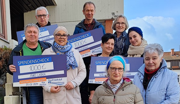 Mitstreiterinnen der Kreativwerkstatt der katholischen Frauengemeinschaft unter der Leitung von Elisabeth Draxler luden im vergangenen Winter zum Basar in das Pfarrheim in der Feuergrabengasse ein und boten dort selbst hergestellte Produkte an. Den Reinerlös von jeweils 1.000 Euro übergaben Draxler und ihre Kreativwerkstatt-Kollegin Christiane Hofmann am Vormittag an Diakon Joachim Szendzielorz als Vertreter der Karitativen Dienste St. Elisabeth, an den pädagogischen Leiter der St. Paulusheime Eberbach, Wolfgang Roesch, und an Annette Bremer vom Sozialdienst katholischer Frauen Heidelberg, Curd Walschburger und Büsra Isik vom AWO-Laden in Eberbach-Nord sowie an Sandra Wäsch und Natalie Reinig vom neu gegründeten Verein “Helfende Engel Neckar-Odenwald". Das Geld wird von allen Institutionen für Menschen in teils prekären Situationen eingesetzt.