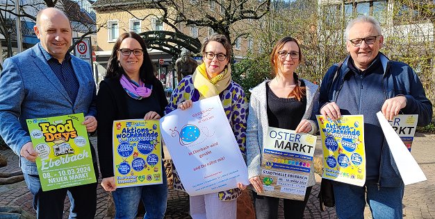Ostermarkt und Food Days mit verkaufsoffenem Sonntag Tobias Soldner (r.) mit den EWG-Mitgliedern (v.l.) Klaus Müller, Susanne Reinig, Carmen Back und Fabienne Ries. (Foto: Claudia Richter)(cr) Mitglieder der Eberbacher Werbegemeinschaft (EWG) und des Lions-Clubs Eberbach laden in Kooperation mit der Stadt Eberbach ab morgen, 8. MĂ€rz, zu einem Aktionswochenende in die Innenstadt ein. Auf der Bühne am Neuen Markt darf man sich auf Livemusik freuen.