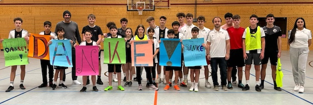 Am Ende des Besuchs bildeten die Spieler/innen mit bunten Plakaten ein herzliches âDankeâ mit einem dicken Ausrufzeichen. Es war für alle ein eindrucksvoller Besuch.