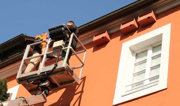 Ohne den kostenlosen Verleih des Hubsteigers der Firma Beisel aus Eberbach wäre die Arbeit von Reinhard Zettl und Rainer Engelhardt vom NABU Eberbach in schwindelnder Höhe nicht möglich gewesen.