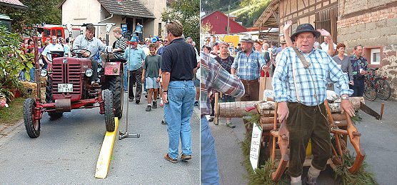 Bei strahlendem Sonnenschein wurde sogleich der erste Traktorgeschicklichkeitswettbewerb zwischen Allemühl und Pleutersbach ausgetragen, an dem sich 17 begeisterte Teilnehmer in acht Disziplinen verglichen. Nach Aufnehmen eines Wassereimers am Traktor mussten die Fahrer vorwärts Pylonen umfahren. Je nach Geschicklichkeit wurden Punkte für berührte oder nicht umfahrene Pylonen abgezogen. Auf dem Parcours wurden auch Becher zu Podesten transportiert und die Traktoren rückwärts eingeparkt. Bei der Zieldurchfahrt mussten die Teilnehmer schließlich noch die durchfahrene Höhe und ihre im Ziel eingebrachte Wassermenge schätzen. Wie sollte es anders sein - freundschaftlich kamen beide Mannschaften aus Allemühl und Pleutersbach überein, dass der Gastgeber zwar formell Punktsieger bei diesem Wettbewerb sei, man nun aber die Siegprämien – ein 15 Liter Fass Bier und einen Präsentkorb – gemeinschaftlich verköstigen wolle.