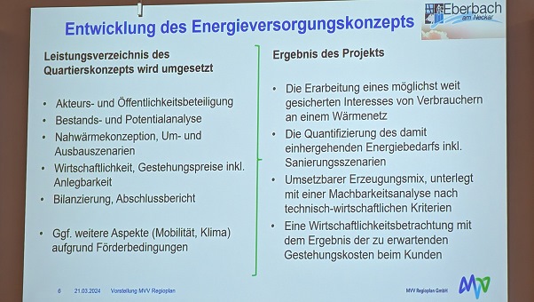 Daniel Jung von der MVV Regioplan stellte die Vorgehensweise vor (siehe Bild). Als mögliche Wärmequellen für die Netze erwähnte er unter anderem Flusswärme aus dem Neckar, Holz aus dem Stadtwald, Abwärme der Industrie (z.B. Gelita) und große Wärmepumpen. Das Konzept hat ein Auftragsvolumen von gut 142.000 Euro und wird mit knapp 107.000 Euro vom Land gefördert. Es soll bis Ende 2024 fertig vorliegen.