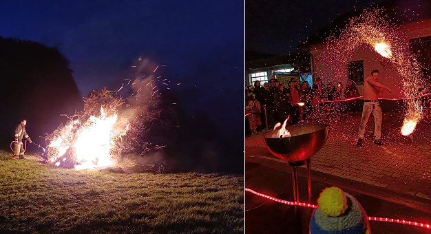 In der Dämmerung wurde neben dem Feuerwehrhaus oben auf der Höhe zwischen Gammelsbach- und Finkenbachtal wieder der große Reisighaufen in Brand gesteckt. Der Feuerschein dürfte weithin sichtbar gewesen sein. Die “Lärmfeuer†gelten als historische Signalmethode zur Übermittlung von Informationen über weite Strecken hinweg. Das Event in Rothenberg wurde wieder ergänzt durch eine Fackelwanderung für die ganz jungen Gäste und eine Feuershow von “Jeremyâ€.