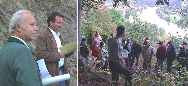Stadt begegnet Gefahren am Waldrand - Sicherungshieb am Itterberg geplant Linkes Bild: Forstamtsleiter Dr.Georg Bungenstab und Bürgermeister Bernhard Martin, rechts: Förster Siegfried Riedl erläutert die Gefahren und Probleme der Waldbewirtschaftung oberhalb der Bebauung am Itterberg. (Fotos:Richter)(hr) Mit Angelegenheiten des Stadtwaldes befassten sich gestern abend Mitglieder von Stadtverwaltung und Gemeinderatsgremien bei ihrer alljährlichen Waldbegehung. Im Mittelpunkt standen diesmal die Probleme und Gefahren der Waldbewirtschaftung an Steillagen oberhalb von Wohngebieten. Bürgermeister Bernhard Martin äußerte Verständnis für die Ängste der Bewohner an Waldrändern angesichts von Baumriesen, die im Falle eines Falles auch ihr Grundstück oder gar ihr Haus treffen könnten. Dabei sei allerdings die tatsächliche Gefahr zumeist viel geringer als das subjektive Empfinden der Anwohner suggeriere. Rings um Eberbach und seine Ortsteile reicht der Wald auf rund 5 km Länge unmittelbar an die Wohnbebauung heran.