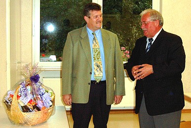Thomas Haas für 25-jährige Tätigkeit in Schönbrunn geehrt - Gewerbepark diskutiert Glückwünsche gab es für Thomas Haas (l.) von Bürgermeister Roland Schilling. (Foto:Böhm)(ub) Vor Beginn der Gemeinderatssitzung würdigte Bürgermeister Roland Schilling die Verdienste seines langjährigen Mitarbeiters Thomas Haas und ehrte ihn mit einem Präsentkorb und einer finanziellen Anerkennung für seine 25-jährige Tätigkeit im öffentlichen Dienst.