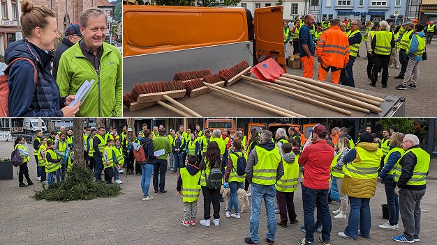 Bürgermeister Peter Reichert und Hauptorganisatorin Denise Michalske konnten beim Start auf dem Neuen Markt viele der insgesamt rund 120 angemeldeten Helferinnen und Helfer begrüßen. Vom städtischen Bauhof wurden dort Sicherheitswesten, Handschuhe, Müllsäcke und Greifzangen und andere Werkzeuge verteilt, bevor dann in mehreren Einsatzgruppen in die verschiedenen Gebiete der Stadt ausgeschwärmt wurde. Bis Mittag sollen in Eberbach und Ortsteilen unter anderem Müll gesammelt sowie Unkraut und Plakatreste entfernt werden, um das öffentliche Erscheinungsbild zu verschönern. Laut Peter Reichert soll die Aktion aber auch beispielgebend sein für andere, auf Sauberkeit in eigenen und öffentlichen Liegenschaften zu achten und Müll - vor allem Zigarettenkippen - nicht achtlos wegzuwerfen.