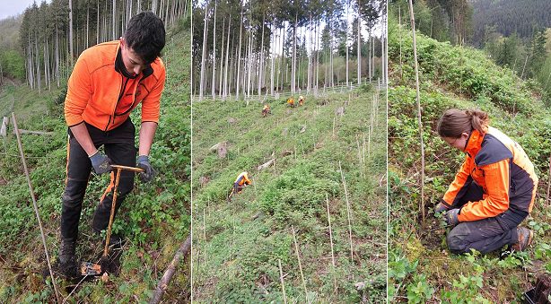 Der Klimawandel und die damit verbundenen Folgen für den Wald und die Forstwirtschaft zeigen sich auch im Odenwald. Revierleiter Jonas Petermann zeigt durch eine Fahrt in seinem Revier FreiflĂ€chen, die durch massiven KĂ€ferbefall in der Fichte entstanden sind. âSorgen hat mir vor allem eine 5 ha groĂe FlĂ€che gemacht, bei der wir nach der ersten Pflanzung einen Totalausfall der Pflanzen durch Trockenheit hatten und jetzt zum zweiten Mal wieder bepflanzenâ erzĂ€hlt der Förster. Wer die FlĂ€che bei Eberbach-Gaimühle sieht, kann erahnen, wie schwer es ist, in diesem steilen und steinigen GelĂ€nde Pflanzlöcher für die kleinen jungen BĂ€ume herzustellen. Für die jungen Auszubildenden von ForstBW eine körperliche Herausforderung, der sie aber gewachsen sind. Vorsichtig werden die kleinen Pflanzen aus den Containern herausgelöst und in die Erde gesetzt. âBesonders wichtig ist, dass das Pflanzloch groĂ genug ist und die Baumwurzel gerade nach unten eingesetzt wird, damit die Wurzel sich gut entwickeln kann und der Baum eine gute Standfestigkeit hatâ erlĂ€utert Petermann. Insgesamt haben die Forstwirtinnen und Forstwirte 11.600 Pflanzen in diesem Frühjahr auf 10 Hektar WaldflĂ€che gepflanzt. Dies entspricht einer FlĂ€che von 13 FuĂballfeldern. Da auf den PflanzflĂ€chen natürlich angesamte JungbĂ€ume integriert werden, ist es möglich mit einer geringen Pflanzenzahl von 1.200 Pflanzen pro Hektar auszukommen. Hier wird mit der Natur gearbeitet und die WiederbewaldungsflĂ€che mit zusĂ€tzlichen, klimastabilen Baumarten ergĂ€nzt. Um den Wald fit für den Klimawandel zu machen, werden diese FreiflĂ€chen in eichengeprĂ€gte MischwĂ€lder umgebaut. So fanden 7.000 Traubeneichen zusammen mit Hainbuchen und Feldahornen ein neues Zuhause im Revier von Jonas Petermann. Aber auch Rotbuchen, LĂ€rchen und die trockenheitstoleranten Esskastanien und Douglasien wurden ausgebracht
