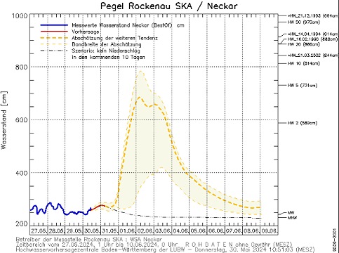 Nach der aktuellen Prognose der Hochwasservorhersagezentrale (HVZ) in Karlsruhe wird aufgrund vorhergesagten Dauerregens mit einem Anstieg der Pegelstände am Neckar gerechnet.