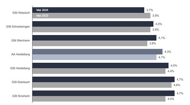 Arbeitslosigkeit in Eberbach im Mai leicht gesunken Die Arbeitslosigkeit im Mai nach Geschäftsstellen. (Quelle: Agentur für Arbeit)(bro) (aa) Die Arbeitslosigkeit im Bezirk Eberbach hat sich von April auf Mai um sieben auf 451 Personen verringert. Die Arbeitslosenquote betrug im Mai 4,7 Prozent, vor einem Jahr belief sie sich auf 4,6 Prozent.