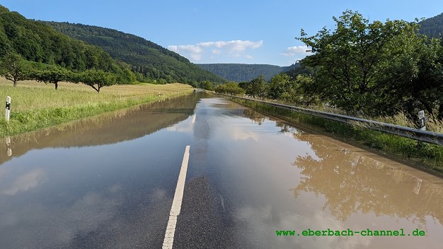 Umleitung in Eberbach-Nord durch den Karlstalweg war deutlich ausgeschildert. Die Einbahnregelung wurde allerdings von meist ortskundigen Autofahrenden häufig ignoriert, besonders im Bereich Waldstraße. Park- und Halteverbote wurden missachtet, und der ansonsten weitgehend gesperrte Karlstalweg wurde teils mit hohen Geschwindigkeiten befahren. Fußgänger mussten hier oft in schlammigen Grünstreifen ausweichen.