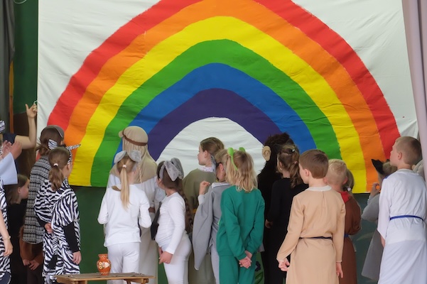 Mit Giraffe und Taube an Bord Die Tiere auf der Arche sehen den Regenbogen und wissen, dass die Sintflut vorbei ist. (Foto: Bernhard Bergmann)(bro) (edo/bb) In einigen Kinderzimmern in Beerfelden fehlen derzeit Kuscheltiere. Sie befinden sich auf der Arche, jenem Schiff des Stammvaters Noah, das in der Bibel beschrieben wird: Gott schickt in seinem Zorn über das Tun der Menschen eine Sintflut. Der gottesfürchtige Noah und seine Familie aber sind rechtzeitig gewarnt worden: Sie sollten sich ein Boot bauen und von jeder Tierart ein Paar mit an Bord nehmen, damit das Leben nach der Flut weitergehen kann. Die Beerfelder Kirchenmusikerin Iris Thierolf hat sich das Musical „‚Jetzt reicht’s!‘, sprach Gott: Noah und die Sintflut“ von Witold Dulski vorgenommen und probt seit Anfang des Jahres mit den Kinderchören und den Flying Vocals (ehemals Jugendchor) der Kirchengemeinde. Am 22. und 23. Juni wird das Musical auf der Bühne im evangelischen Gemeindehaus in der Gabelsberger Straße im Beerfelden aufgeführt, Beginn ist jeweils um 17 Uhr.