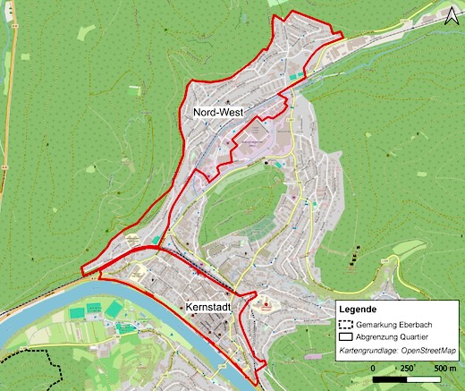 Integriertes Quartierskonzept für Eberbach Quartiersabgrenzung Kernstadt und Nord-West. (Karte: Stadtverwaltung Eberbach)(bro) (stve) Energie einsparen und etwas für den Klimaschutz tun, gleichzeitig Energiekosten senken und Anreize für sinnvolle Investitionen schaffen – diese Ziele verfolgt die Stadt Eberbach mit dem Quartierskonzept, das die MVV Regioplan GmbH aus Mannheim derzeit für die Quartiere Nord-West und Kernstadt erstellt.