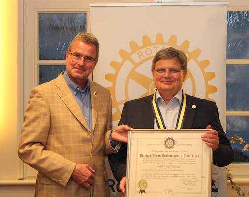 Anschließend überreichte er als sichtbares Zeichen der Präsidentschaft die Schärpe mit rotarischem Rad und die Charterurkunde an seinen Nachfolger Udo Backfisch.