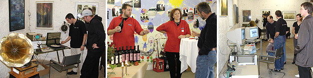 Vier Eberbacher Firmen präsentierten sich in Galerie (Fotos:Claussen)(jc) Gemeinsam zeigten die Werbeagentur Pinselsprünge, Pro Television, Ronald Schmitt Tische und das Reformhaus Wolff gestern und heute Teile ihres Angebots in den Räumen der Galerie ARTgerecht. Die Firma Pinselsprünge zeigte unter anderem neueste Trends zu Kundengewinnung und Grafikdesign. Pro Television hatte eine interessante Auswahl seiner hochwertigen HiFi-Anlagen mitgebracht und ermöglichte in einem Nebenraum das entspannte Hören von altbewährten Scheiben auf High-End-Schallplattenspielern. Das Reformhaus Wolff bot kulinarische Leckerbissen an und lud zur Verkostung von Weinen aus biologischem Anbau. Ins rechte Licht gerückt wurde gesamte Veranstaltung von den Design-Möbeln der Firma Ronald Schmitt Tische.