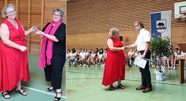 Bei ihrer Abschiedsrede versicherte Karin Spegg, dass ihr der Beruf sehr viel Spaß gemacht habe, und dankte unter anderem all denen, die sie in ihrer beruflichen Laufbahn begleitet und unterstützt haben. Als letzte Amtshandlung übergab sie symbolisch den Schlüssel der Schule an ihre Nachfolgerin (Bild links). Die Amtseinführung von Tanja Ehrhard, die gestern durch die Veranstaltung führte, wird wahrscheinlich nach den Ferien vorgenommen werden.