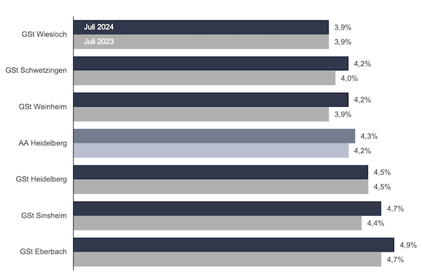 Arbeitslosigkeit leicht gestiegen - Mismatch bleibt große Herausforderung Die Arbeitslosigkeit im Juli nach Geschäftsstellen. (Quelle: Agentur für Arbeit)(bro) (aa) Die Arbeitslosigkeit im Bezirk Eberbach ist von Juni auf Juli um 27 auf 479 Personen gestiegen. Die Arbeitslosenquote betrug im Juli 4,9 Prozent, vor einem Jahr belief sie sich auf 4,7 Prozent.