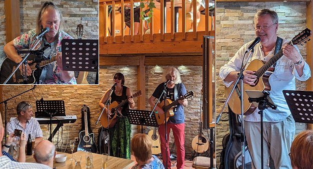 Das Duo “Sanni und Paul” (Susanne Walz und Paul Danquard) begann mit einem neuen “Bardensong” und spielte dann Bewährtes aus seinem Repertoire. Es folgte Ulrich Heimlich (Bild rechts) mit dem Lied "Zwei Gitarren", das er “Sanni und Paul” zum zehnjährigen Bühnenjubiläum im vergangenen Jahr gewidmet hatte. In der Tradition von Reinhard Mey sang er über die Liebe und fröhnte seinem Hang zu melancholischen Balladen (z.B. “CafĂ© für Zwei”, “Aus Zwei wird Eins”). Roland Beigel (Bild oben links) trug im Anschluss unter anderem Cover-Versionen von "Summertime" und "House of the Rising Sun" vor. Jürgen Engelhardt, auch bekannt als “Joe Cocker aus Rockenau”, brachte mit seiner rauen Stimme "Neue Wege gehen" und eine deutsche Version von Lennons "Imagine" zum E-Piano zu Gehör. Martin Jost schlieĂźlich steuerte Cover-Versionen z.B. von "Love the One You Will" und einigen irischen Songs zur Mandoline, Mandorla und Mundharmonika bei.