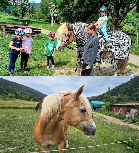 Haflinger-Stute Lia und Freiberger Stute Lovely wurden geputzt, gesattelt und getrenst. Danach ging es auf den Reitplatz, vor allem aber zum ausgiebigen, geführten Spaziergang am Neckar entlang. Wer sich traute, durfte dann auch mal „freihändig“ auf dem Pferderücken durch die Natur schaukeln und so seinen Sitz und Gleichgewichtssinn trainieren.