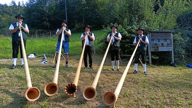 Sie staunten nicht schlecht, als auf der gegenüberliegenden Anhöhe fünf Männer ihre Alphörner zusammenbauten. Das Odenwälder Alphorn-Ensemble vom Verein „Örtliche Geschichte Schlossau/Waldauerbach“, vom Ortsvorsteher als Überraschung verpflichtet, hatte sich eingefunden. Neben traditionellen Alphornwerken aus der alpenländischen Welt brachten sie auch Polkas, Walzer und Märsche zum Erklingen. Der Klang, der sehr anspruchsvoll zu spielenden Instrumente, begeisterte alle Zuhörerinnen und Zuhörer.