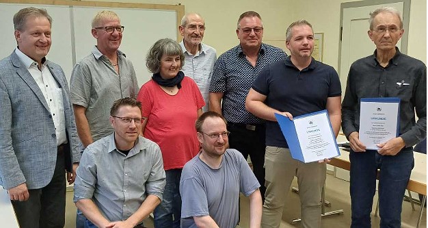 Gut besuchte konstituierende Sitzung  Mitglieder des neuen und alten Lindacher Ortschaftsrats, v.l. Bürgermeister Peter Reichert, Volker Morr, Steffen Bißdorf, Silke Lehr, Avellino Casado, Dr. Oliver Petersen, Ortsvorsteher Achim Helm, Dominik Nintscheff und Lothar Jost (beide ausgeschieden). (Foto:privat)(hr) (wm) Am 19. September fand im gut besuchten Lindacher Dorfgemeinschaftshaus die erste Sitzung des Ortschaftsrats nach der Kommunalwahl am 9. Juni statt.
