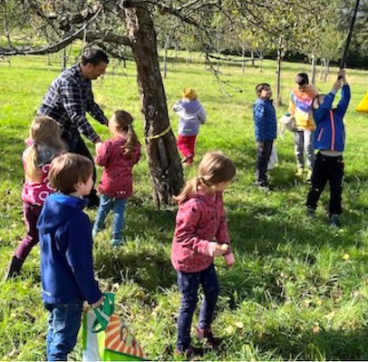 Unter fachlicher Anleitung von Streuobstpädagogin Christina Kunze, Fachwart Antonino Saraceno und Jacqueline Saraceno vom NABU Eberbach ernteten 20 Kinder, bepackt mit Bollerwagen, Apfelpflücker, Erntekörben und Jutesäcken, Äpfel auf dem Eberbacher Breitenstein und lernten die verschiedenen alten Sorten und handwerklichen Schritte zum ersten eigenen Apfelsaft kennen: Ernten, Waschen, Zerkleinern, Pressen, viele Arbeitsschritte zum selbstgemachten Apfelsaft.Â