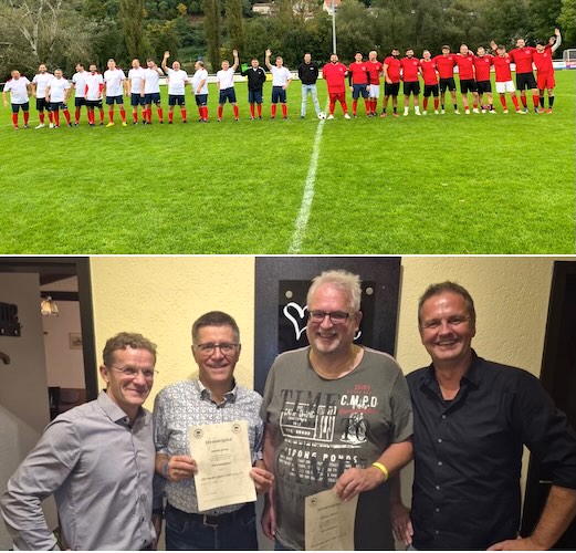 Zwei neue Ehrenmitglieder  Oben: Aufstellung der zwei Legendenteams. Unten v. l.: ESC-Vorsitzender Ralf Bettinghausen, Armin Grein, Thomas Wäsch, ESC-Vorstand Achim Hable. (Fotos: privat)