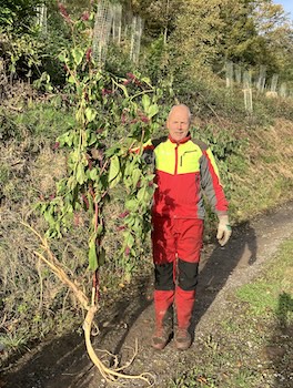 Auf die Anpflanzung von Kermesbeeren sollte verzichtet werden  Forstwirt Jochen Benkwitz mit ausgegrabener Kermesbeere. (Foto: Stadtverwaltung Eberbach)(bro) (stve) Auf den ersten Blick sieht sie schön aus: die Kermesbeere mit ihren großen Blättern, kleinen weißen Blüten und später an purpurfarbenen Stängeln die dunkel-violetten Beeren, die wie an einer Schnur aufgezogen sind. Bereits im 17. Jahrhundert wurde sie als Zierpflanze vorwiegend im südlichen Europa etabliert. Im Forst ist die schöne Exotin jedoch verpönt und stellt eine echte Bedrohung für den Wald dar. So auch im Eberbacher Stadtwald.