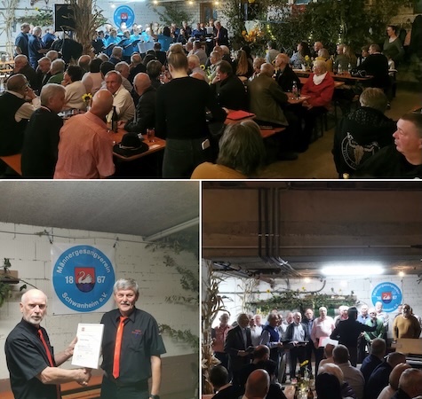 Zu Ehren von Harald Göhrig sang der MĂ€nnerchor aus Schwanheim zwei Lieder. Wilfried Kappel überreichte ihm im Auftrag des badischen Chorverbands eine Urkunde und die goldene Ehrennadel für 40 Jahre aktives Singen im Chor. Harald Göhrig singt nicht nur seit 40 Jahren im Chor, er bekleidet auch das Amt des Kassiers seit 36 Jahren. Kappel würdigte die Verdienste von Göhrig, der wĂ€hrend der 36 Jahre u. a. drei groĂe SĂ€ngerfeste mit mehreren tausend Besuchern finanziell meistern musste.