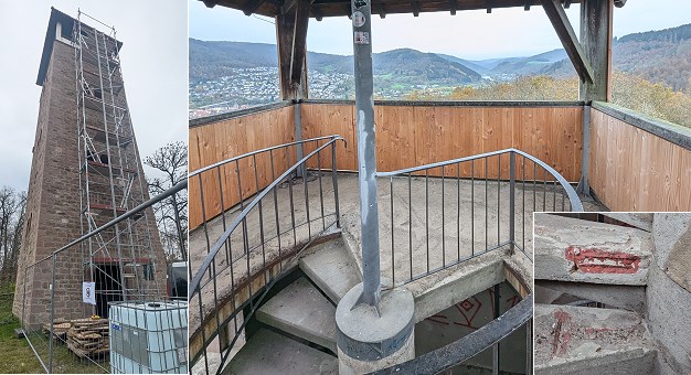 Betontreppe kann nun doch erhalten werden - Deutlich geringere Kosten (Fotos: Hubert Richter)(cr) Seit vergangenen Montag, 11. November, ist der Ohrsbergturm in Eberbach wieder für den Besucherverkehr gesperrt. Eigentlich hatte der Gemeinderat im Juli dieses Jahres die weiteren Sanierungsarbeiten vorläufig gestoppt. Daher fragten wir am vergangenen Freitag nach dem Grund für die neue Sperrung.