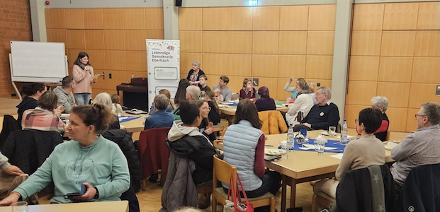 Frieden finden - Füreinander da sein (Foto: privat)(bro) (er) Füreinander da sein, miteinander sein und genießen – das waren die Themen, mit denen die Besucherinnen und Besucher sowie die teilnehmenden Initiativen den Abend des 22. November in Eberbach gestalteten. Eingeladen zu dem gemeinschaftlichen Mahl hatte die Arbeitsgemeinschaft „Interkulturelle Frauenbegegnung“, für die Barbara Coors, Elisabeth Rabl und Ulrike Riedl die rund 60 Anwesenden im evangelischen Gemeindehaus begrüßten, nachdem Tanja Schubert schon mit einer stimmungsvollen musikalischen Begrüßung auf dem Flügel den Abend eröffnet hatte.