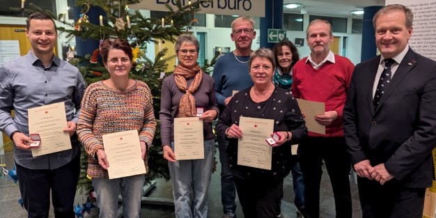 Unterstützt wurde Reichert bei der Übergabe der Urkunden, Ehrungsnadeln und Präsente von Marion Vesper (DRK Eberbach) sowie Bärbel Preißendörfer von der Stadtverwaltung.