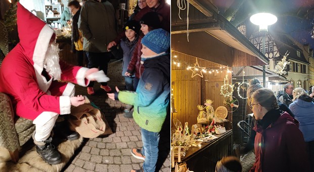 Mit viel Licht, Kerzenbeleuchtung und Weihnachtsmusik sorgten die Ausstellerinnen und Aussteller für eine heimelige Atmosphäre auf dem Platz. Und so nahm sich am Freitagabend selbst der Nikolaus Zeit, besuchte den kleinen Weihnachtsmarkt und beschenkte die kleinen und größeren Kinder.