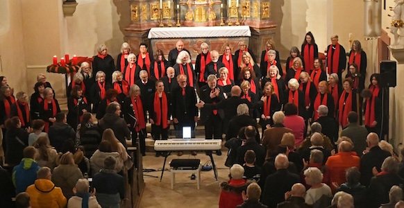 „Singt vom Frieden auf der Welt in dieser Weihnachtszeit“ - mit dieser gesungenen Friedensbotschaft begann das Konzert. Die Chorsprecherin Carola Zimmermann und der Chorleiter begrüßten das Publikum. Sodann führten Petra Weidner und Ulli Heimlich durch das Programm und fragten zuerst: Wo beginnt der Frieden? Sie erinnerten daran, wie wichtig es sei, gerade in der Vorweihnachtszeit zur Ruhe zu kommen und innezuhalten. Manchmal helfe es dabei, so schlugen sie vor, der kindlichen Vorfreude auf Weihnachten eine Chance zu geben, so wie in dem spanischen Weihnachtslied „Friedlich ziehen Menschen über das Land“. Auf diesem Weg sollten die Segenswünsche in dem Lied „An Irish blessing“ eine Begleitung sein. Ganz leise wurde es dann bei dem Lied „Leise rieselt der Schnee“. Wie wichtig es für den inneren Frieden sei, in anderen Menschen eine verwandte Seele zu finden, brachte der Chor mit dem Lied „Perfect“ zum Ausdruck. Frieden bedeutet, so hieß es in der Moderation, dass Menschen einen freundlichen Umgang miteinander pflegen. In dem Lied „Der Weg“ von Herbert Grönemeyer wurde deutlich, dass es auch darum geht, Frieden mit Verlust und Trauer zu schließen. Gerade in solchen Lebensabschnitten ist es wichtig, einen Menschen zu haben, der aufbaut und trägt, wie es bekanntlich in „You raise me up“ beschrieben wird. Die Botschaft des Liedes „Circle of Life“ war schließlich, dass das Leben ein ständiges Geben und Nehmen ist. Dann wechselte der Chor zur christlichen Friedensbotschaft. Mit dem Lied: „Christ der Retter ist gebor’n“ wurde an die Geschichte des unschuldigen Kindes in Bethlehems Stall erinnert. Das Lied „Kommet, ihr Hirten“ erinnerte daran, dass die Ärmsten und Geringsten unter den Menschen seinerzeit als erste davon erfahren haben. Und auch wenn es heute niemand mehr glauben mag: Die Stadt „Jerusalem“ steht für den Traum vom Frieden aller Völker und aller Religionen. Mit dem gleichnamigen Lied riss Markus Beck in seinem Solo das Publikum derart mit, dass es bereits an dieser Stelle des Konzerts stehend applaudiere. Überall auf der Welt wird zu Weihnachten das hohe Lied des Friedens besungen. Aus Frankreich brachte der Chor den „Weihnachtsgesang“ zu Gehör, ursprünglich „Cantique pour Noël“. Dass wir sowohl mit dem Himmel über uns als auch mit der Natur um uns herum in Frieden leben können, beschwor das Lied „Joy to the World“. John Lennons und Yoko Onos Lied „Happy Chrismas“ fasste es ganz einfach zusammen: Wenn wir alle es wollen, ist der Krieg vorüber. Karin Sensbach und Markus Beck übernahmen hier in einem sehr stimmungsvollen Duett den Solopart. Und aus Spanien folgte von José Feliciano „Feliz Navidad“. Gemeinsam mit der Gemeinde sang der Chor anschließend „Oh, du fröhliche“, auf der Orgel unterstützt von Karin Conrath, die auch einige Stücke auf dem Klavier begleitet hatte.