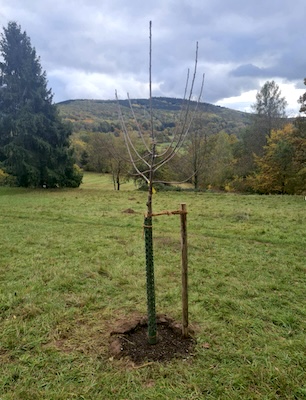 59 Hoch- und Halbstämme wurden bestellt Ein frisch gepflanzter Süßkirschen-Hochstamm auf dem Breitenstein. (Foto: Antonino Saraceno)(bro) (as) Im Rahmen der regelmäßig vom NABU Eberbach organisierten Obstbaum-Sammelbestellungen fanden diesmal 59 Hoch- und Halbstämme im November ihren Weg in Gärten und Landschaft.