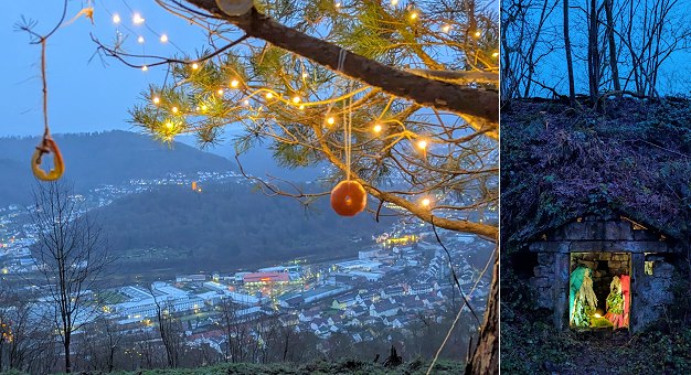Bei unseren Bildern zu dieser kleinen Grußbotschaft haben wir uns wieder für den "Waldweihnachtsbaum" entschieden, der noch bis 26. Dezember in den Abendstunden im Wald neben der Bauriedhütte hoch über Eberbach-Nord leuchten wird, und für die "Waldkrippe" am alten Kratzert-Steinbruch am Weg vom Karlstal zur Bauriedhütte. Auch die Krippe, gestaltet von der SMV der Realschule, wird an den Weihnachtstagen noch beleuchtet sein, meist zwischen 14 und 16.30 Uhr.