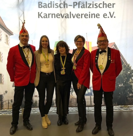 Goldener Löwe für Mitglieder des Clubs Eulenspiegel V. l.: Roland Schneider, Daniela Lindenmuth, Barbara Krawczyk, Stefanie Müller-Heun, Roman Krawczyk. (Foto: privat)(bro) (dl) Auch in diesem Jahr wurden die zwei langjährigen Mitglieder des Clubs Eulenspiegel, Daniela Lindenmuth und Barbara Krawczyk, mit dem „Goldenen Löwen“ ausgezeichnet. Die Verleihung fand am 5. Januar im feierlichen Rahmen in der Stadthalle in Speyer statt. Zu dieser reiste der Club Eulenspiegel Eberbach mit einer Abordnung an, um diesen besonderen Tag mit seinen Mitgliedern zu feiern.