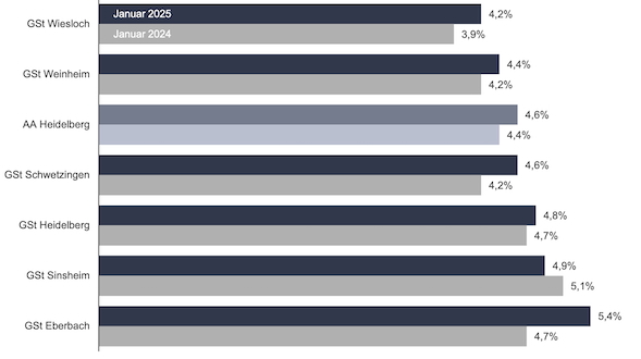 "Der Arbeitsmarkt in unserer Region zeigt sich trotz des Anstiegs der Arbeitslosigkeit vergleichsweise stabil. Das liegt vor allem an unserer Wirtschaftsstruktur, die stark von den Bereichen Gesundheit, Soziales und Dienstleistungen geprägt ist. Diese Branchen sind weniger konjunkturanfällig und sorgen für eine gewisse Stabilität, auch in wirtschaftlich herausfordernden Zeiten“, sagt Klaus Pawlowski, Chef der Agentur für Arbeit Heidelberg.
