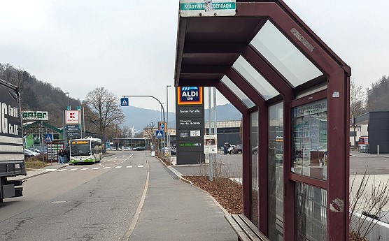 Während der Dauer der Baumaßnahmen bleibt die Bushaltestelle auf der Seite Kaufland/ Hagebaumarkt (hinten im Bild) in Betrieb. Die Haltestelle in Fahrtrichtung Stadt ist während dieser Zeit nicht nutzbar.